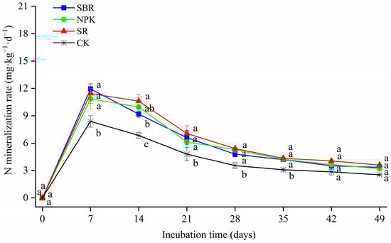 Dynamics of N mineralization rate of different long-term straw return modes. Different lowercase letters indicate significant differences (p < 0.05) among the treatments. CK: no chemical fertilizers application with straw removal; NPK: chemical fertilizers application with straw removal; SBR: straw burned return with reducing chemical fertilizers; SR: straw return with reducing chemical fertilizers.