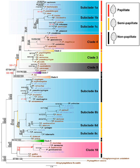 - Yang, X.; Tyler, B.M.; Hong, C. An expanded phylogeny for the genus Phytophthora. IMA Fungus 2017, 8, 355–384. [Google Scholar] [CrossRef] [PubMed] [Green Version]
