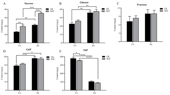 Effect of sucrose treatment on the contents of (A) sucrose, (B) glucose, (C) fructose, (D) G6P, and (E) T6P in seed coat (Co) and endosperm (En) of P. ostii at 50 days after flowering. The black bar represents the control group, while the grey bar represents the sucrose-treated group. Each value represents the mean ± SD of three replicates (n = 3). Asterisks indicate significant differences between the sucrose treatment group and the controls: * p < 0.05; ** p < 0.01; *** p < 0.001; **** p < 0.0001 (one-way ANOVA).