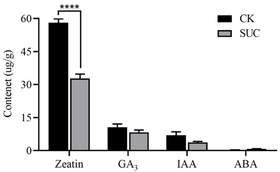Effects of sucrose treatment on the contents of zeatin, GA3, IAA, and ABA in endosperm of P. ostii. The black bar represents the control group, while the grey bar represents sucrose-treated group. Each value represents the mean ± SD of three replicates (n = 3). Asterisks indicate significant differences between the sucrose treatment group and the controls: **** p < 0.0001 (t-test).