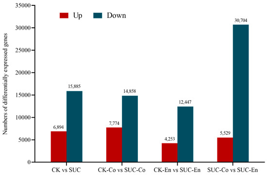 Statistics of the number of differentially expressed genes in four groups. The dark red represents upregulated genes, while the dark blue represents downregulated genes. CK, seed as the control; SUC, seed with sucrose treatment; CK-Co, seed coat as the control; SUC-Co, seed coat with sucrose treatment; CK-En, endosperm as the control; SUC-En, endosperm with sucrose treatment.