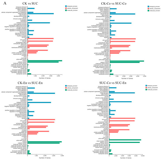 GO analysis was used to classify the functions of the annotated DEGs with sucrose treatment. According to the GO classification, all DEGs were divided into three functional categories: molecular function, cellular component, and biological process, with 54 functional groups in total. As is shown in Figure 4A, in the CK vs. SUC group, a total of 39,345 unigenes were annotated, of which ‘Binding’ and ‘Catalytic activity’ were the two subclasses with the highest proportion, including 4496 and 4039 unigenes, respectively. Comparing CK-Co with SUC-Co, there were 42,671 unigenes annotated. Among them, in the classification of molecular function, cellular components, and biological process, the subclasses of ‘Binding’, ‘Cell’, and ‘Cellular process’ occupied the majority, involving 4924, 3733, and 3654 unigenes, respectively. The results of GO annotation of the remaining two groups were similar to the CK-Co vs. SUC-Co group.