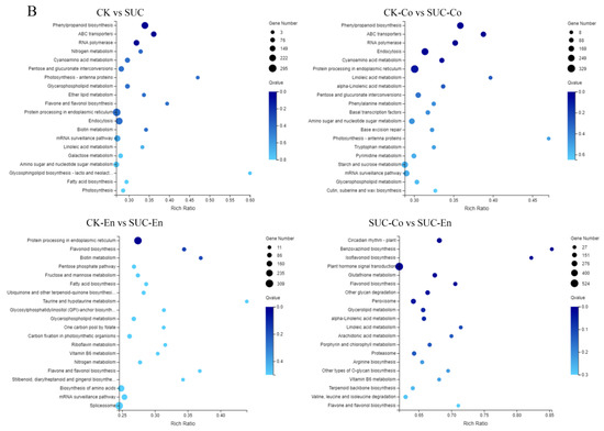 To further explore the functions of the DEGs, we mapped the genes to terms in the KEGG database and compared this with the whole transcriptome background to search for biological pathways in which genes were significantly enriched. It was found that the metabolic pathways of P. ostii involved mainly five categories: ‘Cellular Processes’, ‘Environmental Information Processing’, ‘Genetic Information Processing’, ‘Metabolism’, and ‘Organismal Systems’. The five pathways could be further divided into 19 subclasses, of which the two groups with the largest number of unigenes were ‘Global and overview map’ and ‘Carbohydrate metabolism’. After the DEGs in CK vs. SUC, CK-Co vs. SUC-Co, CK-En vs. SUC-En, and SUC-Co vs. SUC-En were matched to the KEGG database for enrichment analysis, the top 20 metabolic pathways with the smallest Q-values were illustrated in Figure 4B. The DEGs in CK-Co vs. SUC-Co were enriched in 134 metabolic pathways, among which the number of DEGs in the ‘Protein processing in endoplasmic reticulum’, ‘Endocytosis’, ‘Phenylpropanoid biosynthesis’, and ‘starch and sucrose metabolism’ pathways was relatively large, namely, 329, 273, 246, and 228 DEGs, respectively. Pathway enrichment analysis also disclosed that the annotated changes between CK-En and SUC-En were matched to 132 pathways, and were mostly involved in ‘Protein processing in endoplasmic reticulum’, whereas the annotated changes between CK and SUC were matched to 132 pathways and mainly participated in ‘Phenylpropanoid biosynthesis’, ‘ABC transporters’, and ‘RNA polymerase’.