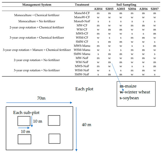The experimental treatments were in different management systems: monoculture of maize, winter wheat, and soybean, 2-year crop rotation (winter wheat–maize) with and without chemical fertilizer and 3-year crop rotation (winter wheat–soybean–maize) with and without chemical fertilizer and manure (Table 1; Figure 2).