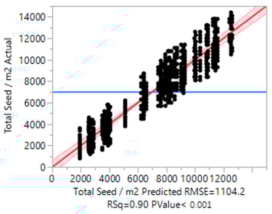Actual and predicted values of the total seed population in soil obtained by the mixed model. R2 and RMSE are shown.