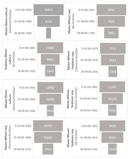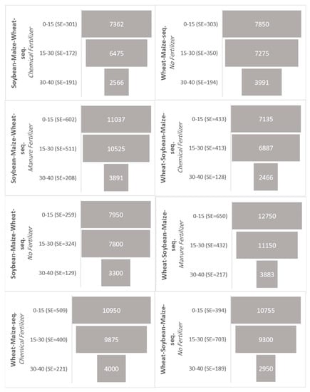 The number of seeds in soil significantly decreased from surface layer to deep soil (Figure 5). In the topsoil, soybean monoculture with no fertilizer (MonoS-NoF) had the largest weed seed populations. It was followed by wheat monoculture + CF, WSM + manure, and MWS + manure. In contrast, WSM, SMW, and MWS all with CF had the least weed seeds in the topsoil. At a soil depth of 15–30 cm, SMW, WSM, and MWS with CF had the least weeds seed populations, while WSM + manure, wheat monoculture + CF, and SMW + manure showed the largest seed populations. In general, monocultures, especially the soybean monoculture which is a less competitive crop against weeds than maize and wheat, were more infested by weed seeds. The crop sequence efficiency in decreasing weed seed bank was highly dependent on the fertilizer management, as with CF, the three-year crop rotations had significantly lower seed bank, while with manure, the effect of crop rotations was eliminated.