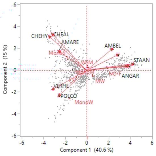 The biplot based on PCA shows correlations among dominant weed species (density > 50 seeds/m2) and crop sequence or fertilizers. The soybean monoculture was more correlated with AMARE (Amaranthus retroflexus L.), CHAAL (Chenopodium album L.), and CHEHY (Chenopodium hybridum L.). Species STAAN (Stachys annua L.) and ANGAR (Anagallis arvensis L.) were more abundant in no-fertilizer systems, and POLCO (Bilderdykia convolvulus L.) and VERHE (Veronica hederifolia L.) were found more frequently in wheat monoculture and CF systems. However, PCA was able to explain 55% of the correlations (Figure 6).