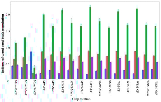 Crop rotations with no fertilizers had fewer weed seeds in the soil. It was formerly shown that low input cropping systems suffer less from weeds [22] and provide more sustainable weed management in the long-term [31]. High input agriculture especially those with a high amount of fertilizers favor weeds over crops [32]. Weeds used to uptake more fertilizers and their luxury consumption allows them to take advantage of crops, gain larger canopies, and produce more seeds [33].