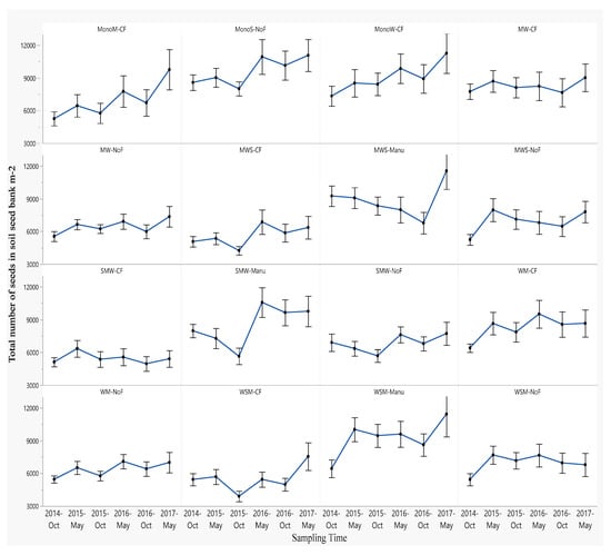 The interactions between management systems (combination of crop sequences and fertilizer) and sampling time were also significant in weed seed bank populations (p < 0.0001, Table 2). Comparing monocultures, soybean monoculture had a higher weed seed bank population followed by wheat monoculture. Wherever manures had been applied seed bank population was higher, and conversely in NoF and CF, the seed bank populations were lower (Figure 8).