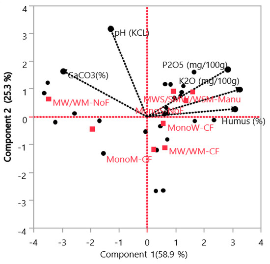 Figure 9 depicts the correlations among soil properties and crop rotation systems. Chemical fertilizers are on the opposite side of soil pH indicating that CF applications decreased soil pH. Manures are correlated to P2O5, K2O, and humus percentage, irrespective of crop rotations, while maize monoculture + CF shows no correlation with the respective components. However, soybean monoculture with NoF was found to be rich in P2O5, K2O, and humus percentage, which indicates its ability to enrich soil even with no fertilizers.