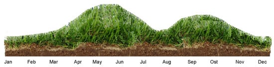Late spring and early autumn are periods of frequent mowing in Europe and North America’s temperate climate zones corresponding to timing of growth of grasses during optimal temperatures and light conditions. As a result, the biomass of clippings is about 5.3 times greater than in the middle of the summer [5,6]. The intensity of grass elongation growth in late spring/early autumn can be estimated as fourfold higher than in March and in November, at the beginning and the end of annual vegetation, and 2.5 times higher as compared to the midsummer (Figure 1).