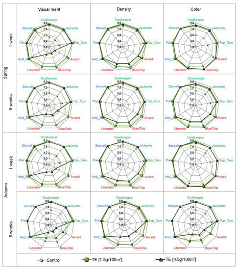 The trinexapac-ethyl application resulted in variation of visual scores for different turf species but not among varieties within species (Figure 2, Supplementary Table S1). The Kentucky bluegrass was the most sensitive: a high TE dose irreversibly decreased the turf’s visual merit, evaluated in spring was changing from 8 points in control to 3 after one week and 5 points after five weeks post-treatment. No regeneration post five weeks was detected in the autumn. On the contrary, the visual merit of perennial ryegrass was enhanced by 4 points, independently of the dose. The tall fescue turfs were ideal in all conditions. Turf density and color were less affected than visual merit. Turf density was, in general, high (7–9 points). Only the Kentucky bluegrass turfs were thinned via the high TE dose (5 points). Moreover, its color was light green, and after the TE treatment, it became even weaker. On the contrary, the perennial ryegrass color became darker via the TE treatment, independently of term and dose (increasing up to 8 points) (Figure 2, Supplementary Table S1).