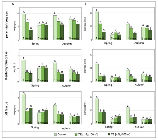 The effect of TE doses on grass regrowth in spring and autumn, after 1 and 5 weeks post-TE-application: (A) height [cm]; (B) Dried clippings biomass [g/100 m2]. Letters designate homogeneous groups within the term, based on the post-hoc Duncan test, with probability ≥95%. ANOVA analysis is presented in Supplementary Materials Table S2.
