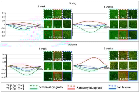 The Chlorophyll Index (CI) reflects the turf greenness by giving information about the relative chlorophyll content in plants. The higher the CI, the greener the turf is. In the first-week post-TE treatment, the CI of control plots in spring was more elevated than treated ones except for the Goalkeeper variety of perennial ryegrass. In five weeks, in spring and autumn, CI was higher on TE-treated plots by 22% on average. Kentucky bluegrass and tall fescue (beside Pixi variety) responded to a single dose (on average by 60% CI increase, whereas perennial ryegrass to a triple dose by 80%) (Table 4).