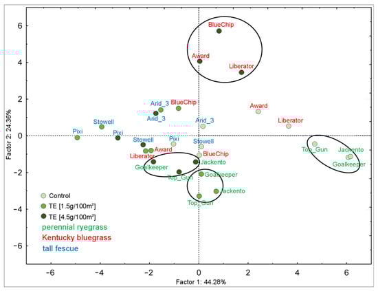 Four factors explained over 90% of the cumulative variance (Supplementary Table S4). The first component (PC1) explains 45% of the variance and includes 11 out of 16 parameters used for PCA. Extreme negative weights (<−0.9) have: PIABS (performance index), FV/FO (efficiency of the water-splitting complex on the donor side of PSII), FV/FM (the ratio of variable and maximal fluorescence reflecting the force of the photosynthetic light reactions) and RCABS (the number of active reaction centers in chlorophyll antennas per absorption). The second component explains 26% of the variance and includes eight parameters, among which strong negative weights (<−0.7) belonged to FO (initial fluorescence) and FM (maximal fluorescence). Finally, factors 3 and 4 explain about 20% of the variability. PC3 components with positive weights (>+0.5) were: visual merit and turf density. PC4 components were: TFM with a positive weight (>+0.8), and the Chlorophyll Index with a negative weight (<−0.6). PCA grouping in a two-dimensional coordinate system was as follows: perennial ryegrass, three groups of varieties: control, low, and high TE doses; Kentucky bluegrass, only one group separated upon high-TE treatment; tall fescue varieties not grouped (Figure 5).
