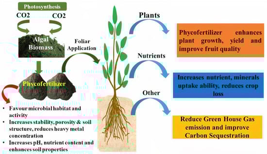 Algal biomasses are important because of their high fiber content, which helps to retain soil moisture and thereby improves the availability of nutrients and trace elements. Photosynthesis performed by algal cells protects the plant root system in terms of respiration against anaerobiosis. In plant growing systems, algae produce plant growth regulators such as cytokinin, auxin, gibberellin, micro and macro elements, amino acids, vitamins, and abscisic acid, which have a major role in crop development and higher crop yield [44].