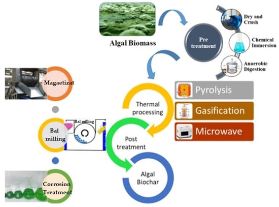Organic biomass, such as crop residues, forest residue, animal manure, algal biomass, etc., are significant sources of biochar production [34]. Biochar is a porous material produced from organic materials in the pyrolysis process that happens in an oxygen-depleted environment at various temperatures. Many approaches are used to produce algal biochar (herein phycochar) from algae, as shown in Table 2.