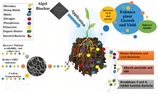According to Ross et al. [159], adding biochar to soil supplies a medium for increased microbial activity. Few studies into the applicability of algal biochar for carbon sequestration or soil fertility enrichment have been undertaken, even though the potential of both macroalgae and microalgae has previously been recognized. To maximize the value of biochar, the quality of the feedstock biomass must be higher in nutrients because the higher the nutrient content of organic waste, the greater the benefits of the biochar. Biochar is interesting in that it is a carbon-negative technique. Some of the advantages of using biochar are that it reduces soil nutrient leaching, improves nutrient availability for plants, improves runoff water quality, reduces reliance on artificial fertilizers, reduces aluminum toxicity of plant microbiomes, improves soil quality and pH, and thus contributes to bioremediation. In addition, its application leads to decreases in N2O and CH4 emissions from soils, thereby further reducing green greenhouse gas excretion. Biochar is remarkable because it is a “carbon-negative” process [160]. Although there are many benefits of algal biochar, there are some disadvantages to the collection of algal biomass for synthesizing biochar. The algal collection is a big hurdle in making biochar. Microalgae require specific cultivation conditions, which raises the chances of contamination and increases the cost of additional nutrients. It is a time-consuming and incompatible procedure as compared to other microorganism strains [161]. One disadvantage of biochar is that some soils may not benefit as much as others, and not all crops respond to biochar in the same manner. Depending on the agricultural practice, biochar may bind to agrochemicals and reduce their efficacy. Biochar has been demonstrated in studies to have neutral or detrimental effects on agricultural fields [162].