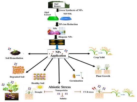Nanoparticles (NPs) are among the latest developed technologies that have gained interest in many disciplines, including chemistry, physics, agriculture, biotechnology, material science, medical science, and engineering. The biological synthesis of NPs (e.g., microorganisms such as bacteria, fungi, and yeast, microalgae, or plant extracts including macroalgae) is considered a safe, simple, eco-friendly approach that uses simple reducing agents instead of hazardous chemicals [167]. NPs have several applications for solving agricultural and environmental problems and maintaining sustainable agriculture and healthy ecosystems. This technology can enhance food quality and safety, reduce the overuse of fertilizers and pesticides, improve nutrient absorption from soils, and increase crop yields [168]. NPs are synthesized via two approaches: bottom-up and top-down. The first approach is through chemical reactions among atoms/ions/molecules, but the second involves mechanical methods to break down pieces of material to generate the required nanostructure sizes [169]. Micro and macroalgae are considered important sources of bioactive secondary metabolites with a wide range of biological activities [170]. Algal secondary metabolites reduce and stabilize metal salts to metal, metal oxide, or bimetallic NPs [171]. Algae can accumulate high levels of metals from their immediate environment and convert them to NPs, indicating that they are among the best organisms for the green synthesis of NPs. Additionally, Kannan et al. [172] demonstrated that algaes’ high metal absorption capacity and dominance make them a low-cost raw material. Algae are increasingly being employed for the biogenic synthesis of nanoparticles due to their ease of availability and efficiency. Asmathunisha et al. [173] found a range of compounds in algal extracts, such as phenolics, pigments, flavanones, amines, terpenoids, amides, proteins, alkaloids, etc., which aided in the formation of NPs. The accessible functional groups and enzymes in algal cell walls work as reducing agents, resulting in metal and metal oxide NP reduction and synthesis under environmental circumstances.