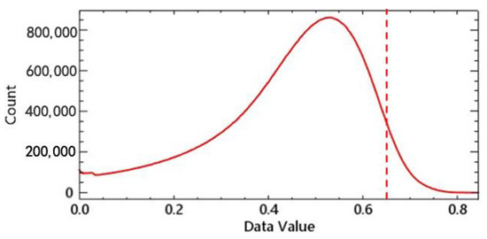 Statistics of normalized difference vegetation index (NDVI) values (the dashed line is at 95% of the cumulative frequency of NDVI values).