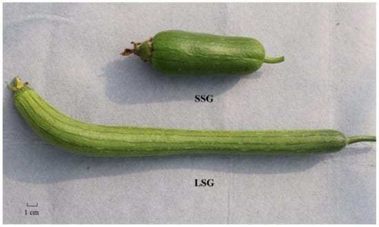 The materials of sponge gourd used in this study were long sponge gourd (LSG) and short sponge gourd (SSG) (Figure 1). Plants were grown at the Yangdu Research and Innovation Base, Zhejiang Academy of Agricultural Sciences, under normal field management. Three fruits in each material were collected 10 days post pollination from three different plants, and the middle part of fruits were sliced and frozen in liquid nitrogen. The samples from each fruit were considered as a biological replicate and three biological replicates per material were used for subsequent RNA-Seq analysis.