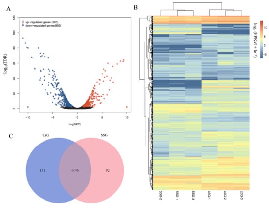 Analysis of DEGs between LSG and SSG. (A) Volcano map representing the number of DEGs between LSG and SSG. (B) Heat map of DEGs between LSG and SSG; the heat map of DEGs was analyzed using log2 (FPKM + le−2) at https://www.omicstudio.cn/index (accessed on 10 October 2021). (C) Venn diagram of DEGs commonly or specifically expressed in LSG and SSG.