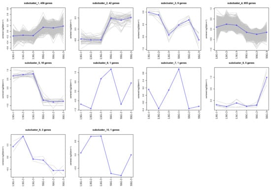 A total of 1390 genes were differentially expressed between LSG and SSG. Of these DEGs, 885 and 505 were respectively downregulated and upregulated in SSG compared with LSG (Table S2, Figure 2A,B). A Venn diagram analysis revealed 1146 DEGs commonly expressed in LSG and SSG. Moreover, 131 DEGs showed specific expression in LSG and 92 DEGs showed specific expression in SSG (Figure 2C). The DEGs were classified into 10 subclusters, with subcluster 4 (855 DEGs) and subcluster 1 (456 DEGs) the largest (Figure 3). The DEGs in subclusters 1 and 2 were upregulated in SSG for all libraries compared with LSG. However, the genes in subclusters 4 (855 DEGs), 5 (18 DEGs), and 9 (2 DEGs) had similar downregulated expression patterns in SSG compared with LSG for all libraries.