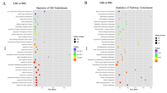 GO and KEGG enrichment analysis of DEGs between LSG and SSG. (A) GO enrichment analysis of DEGs; (B) KEGG enrichment analysis of DEGs.