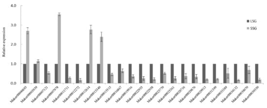 A total of 23 DEGs were selected for qRT-PCR validation (Figure 5). Five of the DEGs, namely, Maker00000693 (HVA22-like protein), Maker00003939 (beta-ureidopropionase), Maker00007978 (glutamate receptor), Maker00012614 (divaricata-like), and Maker00013340 (hypothetical protein Csa_018195), were expressed at higher levels in LSG than in SSG. The following 18 DEGs were expressed at lower levels in LSG than in SSG: Maker00022955 (ERF105-like), Maker00022958 (ERF106-like), Maker00029876 (NAC protein 55), Maker00034132 (bHLH30-like), Maker00039070 (MYB20-like), Maker00025361 (MYB1-like), Maker00031399 (WRKY 22-like), Maker00028716 (WRKY 34), Maker00039350 (expansin A9), Maker00023770 (xyloglucan endotransglucosylase/hydrolase protein 9-like), Maker00019916 (cyclin-dependent kinase C-2-like), Maker00033389 (IAA-amino acid hydrolase ILR1-like 3), Maker00007121 (gibberellin-regulated protein 1-like), Maker00016867 (abscisic acid receptor PYL2), Maker00013515 (salicylic acid-binding protein 2), Maker00011711 (mitogen-activated protein kinase kinase kinase 18-like), Maker00029913(ethylene synthase), and Maker00012272 (mitogen-activated protein kinase kinase kinase 17-like). The qRT-PCR data were generally consistent with the RNA-Seq results.