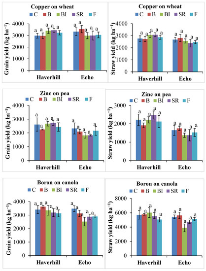 The grain and straw yields of wheat, pea, and canola were not increased by any of the micronutrient application strategies at the two sites (Haverhill soil association and Echo soil association) in the farm field near Central Butte in 2015 (Figure 1). It is important to note that total rainfall at this site during May and June 2015 was only 9 mm versus the historical (30 years) long-term average of 116 mm (https://www.meteoblue.com/ (accessed on 15 May 2018). Furthermore, pre-seeding soil test results indicated that extractable plant available micronutrient concentrations at both were in the marginal to sufficient range. For example, soil DTPA-extractable Cu levels of both Haverhill and Echo site soils in the 0–15 cm depth were above the critical concentration of 0.4 mg Cu kg−1 soil (Table 3; [21]). Usually, the crop yield responses to micronutrient fertilization are often influenced by local soil and environmental factors. Considerable research has confirmed the potential incidence of Cu deficiency, and significant yield response of wheat to Cu fertilization on a broad range of western Canadian soils [15,18,21,23,42,43]. Broadcast and incorporation of Cu sulfate was often effective in correcting the deficiency problem to optimize wheat yield [21,43]. To our knowledge, there is no documented evidence of profitable wheat yield response of Cu fertilization on marginally deficient soils with a DTPA-extractable Cu concentration range of 0.4 to 1.0 mg Cu kg−1 [21,43]. In this study there was also no response of wheat to Cu addition on “marginally deficient” soils. Therefore, initial Cu fertility assessment should be taken into consideration prior to making a fertilization decision. There was also no yield differences between the Haverhill and Echo association sites. (Figure 1). This suggests that little would be gained from managing the different soils and landscape positions differently in a Cu fertilization plan for the field.