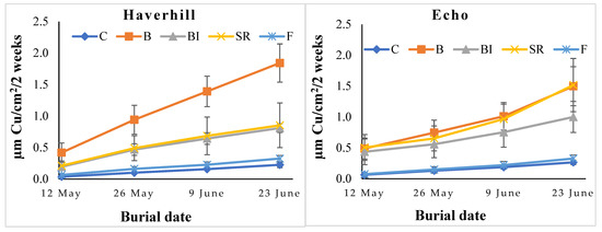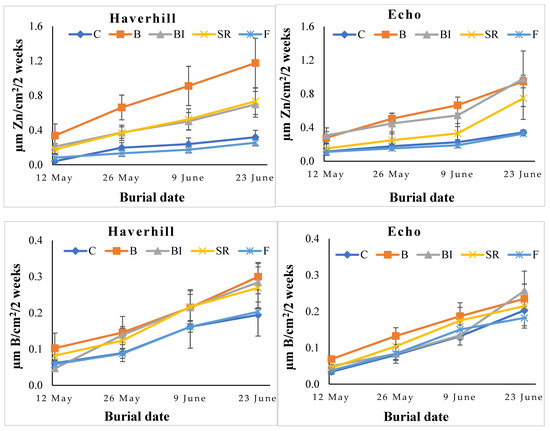 Mean cumulative nutrient supply rates of Cu, Zn, and B, measured by in situ burials of Plant Root Simulator (PRS)-probes at two weeks intervals during seeding to maximum vegetative growth stages. The Cu, Zn, and B fertilizer were applied for growing wheat, pea, and canola, respectively. Crops were grown at two sites in the field representing two different landscape elevation positions classified as Haverhill (upslope) and Echo (downslope) soil associations, respectively. Treatment evaluation includes C: control; B: broadcast; BI: broadcast and incorporation; SR: seed row banding; and F: foliar methods of fertilizer application. Error bar represents standard error of mean.