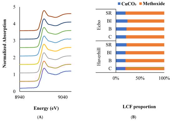 (A) Normalized Cu XANES K-edge spectra of post-harvest soils collected from landscape-based Cu fertilization field trials in south-central Saskatchewan conducted on Haverhill (upslope) and Echo (downslope) soil associations in a farm field. (B) Results of linear combination fit, showing the relative changes in Cu speciation among treatments. Treatments are C: unfertilized control; B: broadcast; Cu BI: broadcast and incorporation Cu; and SR: seed row banding of sulfate form of Cu fertilizer at the rate of 2 kg ha−1.