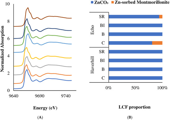 (A) Normalized Zn XANES K-edge spectra of post-harvest soils collected from landscape-based Zn fertilization field trials in south-central Saskatchewan conducted on Haverhill (upslope) and Echo (downslope) soil associations in a farm field. (B) Results of linear combination fit, showing the relative changes in Zn speciation among treatments. Treatments are C: unfertilized control; B: broadcast Zn; BI: broadcast and incorporation Zn; and SR: seed row banding of sulfate form of Zn fertilizer at the rate of 2 kg ha−1.