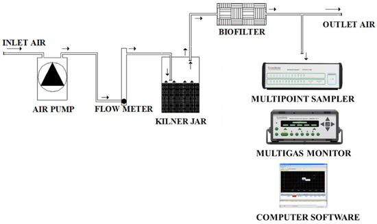 The experiment was made in a climatic room using a laboratory system developed by Pereira et al. [31] to mimic scale biofilters (Figure 1). Briefly, a system of twelve laboratory scale biofilters (H = 13.5 cm, Ø = 9.5 cm) was connected to Kilner glass jars (H = 23.0 cm, Ø = 10.5 cm, volume = 2000 mL) filled with 1000 mL (H = 11.5 cm) of pig slurry each and under a constant airflow rate (2500 mL min−1). A flow meter (AalborgTM FT10201SAVN, Aalborg, Denmark) connected to a small pump (KNF, model N010.KN.18, Neuberger GmbH, Freiburg, Germany) assured the constant airflow rate of each jar. The NH3, N2O, CO2, and CH4 concentrations from the outlet air were monitored under constant temperature (20 °C), and in the next 35 days to the application of 100 g of the biofilter mixture, being composed by 75% tomato waste and 25% rice husk. Each one of the four treatments with three replications were added to each Kilner jar (1000 mL of slurry), leaving an equal volume of empty headspace between the slurry surface and the lid. A first Teflon tube (Ø = 3000 µm) was inserted into a septum for air inlet (20 mm of paste surface) and a second Teflon tube was symmetrically positioned in another septum for air outlet. The inlet air came from inside the climate room and passed through NH3 retention filters coated with oxalic acid, while the exhaust air from the biofilters was expelled out of the climate room through a hood.