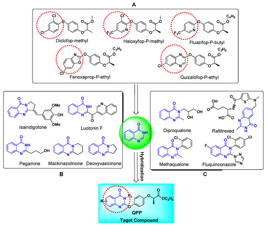 Design of target compound QPP by molecular hybridization strategy. (A)commercial APP herbicides; (B) the natural quinazolin-4(3H)-ones; (C) commercial drugs containing quinazolin-4(3H)-one motif.