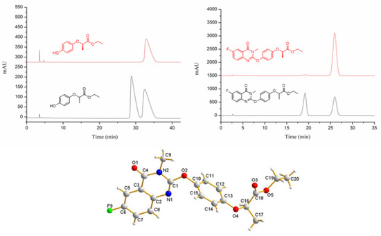 Furthermore, to demonstrate that the reaction conditions have little effect on the chiral carbon configuration of the target compounds, the enantiomeric excesses (ee) values of the target compound QPP-7 and intermediate (R)-2-(4-hydroxyphenoxy)propionic acid were tested. The enantiomeric excesses were determined by HPLC analysis over a chiral column (Daicel Chiralcel OD-H, eluted with hexane-isopropyl alcohol; monitored by UV detector). The results showed that the ee values of (R)-2-(4-hydroxyphenoxy)propionic acid and QPP-7 are 100% and 95.8%, respectively. In addition, the configuration of compound QPP-7 was confirmed using the X-ray diffraction analysis (CCDC 2183936, Figure 2).