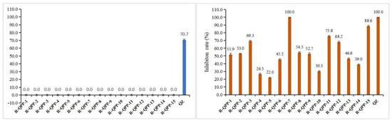 The in vitro herbicidal activities of the target compounds QPP-1 to QPP-15 were preliminarily determined by the B. campestris root test and E. crusgalli cup test at a dosage of 10 μg/mL. Commercial herbicide quizalofop-P-ethyl was selected as the positive control sample. As shown in Figure 3, some of the target compounds, such as QPP-1 to QPP-3, QPP-7 to QPP-9, QPP-11, QPP-12, and QPP-15, exhibited good herbicidal activity against the monocotyledonous plant E. crusgalli with >50% inhibition. Among them, compound QPP-7 exhibited excellent herbicidal activity against E. crusgalli with 100% inhibition, which is equal to commercial herbicide quizalofop-P-ethyl. However, the target compounds have no inhibition against the dicotyledonous plant B. campestris. This finding indicated that the target compounds have stronger herbicidal activity against monocotyledonous plant.