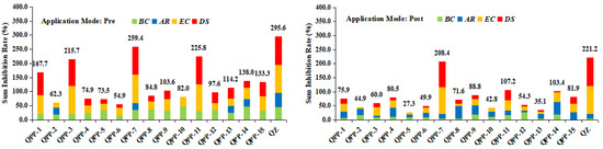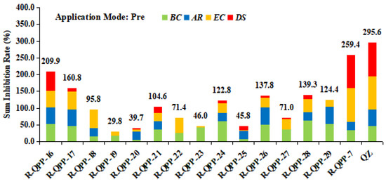 Based on the above preliminary bioassay results, the herbicidal activity of target compounds QPP-1 to QPP-15 was further tested on four species that were representative of monocotyledonous and dicotyledonous plants at a dosage of 1500 g ha−1 located in a greenhouse. As shown in Figure 4, in most cases, the target compounds displayed stronger herbicidal activity against monocotyledonous plants than dicotyledonous plants. Moreover, it was found that most of the target compounds have stronger pre-emergent herbicidal activity than post-emergent herbicidal activity. For example, compounds QPP-1, QPP-3, QPP-7, and QPP-11 exhibited good herbicidal activity against all the weeds tested with sum inhibition 167.7%, 215.7%, 259.4%, and 225.8% under pre-emergence conditions, respectively, while these compounds have lower sum inhibition (75.9%, 60.0%, 208.4%, 107.2%, respectively) under post-emergence conditions.