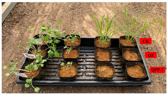 Photographs illustrating the herbicidal activity of QPP-7 under pre-emergence conditions at a dosage of 375 g ha−1; From left to right: B. campestris, A. retroflexus, E. crusgalli, D. sanguinalis.