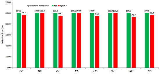 Herbicidal spectrum testing of compound QPP-7 under pre-emergence conditions at a dosage of 375 g ha−1; Echinochloa crusgalli (EC), Digitaria sanguinalis (DS), Pennisetum alopecuroides (PA), Setaria viridis (SV), Eleusine indica (EI), Avena fatua (AF), Elymus dahuricu (ED), Spartina alterniflora (SA).