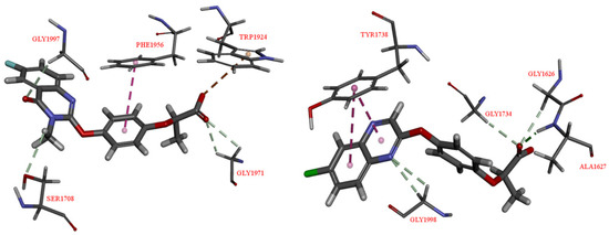 The docking binding mode of the free acid of QPP-7 (Left) and quizalofop-P-ethyl (Right) to acetyl-CoA carboxylase (ACCase) (PDB code: 1UYR).