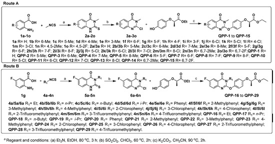 As depicted in Scheme 1, the target compounds QPP-1 to QPP-15 were prepared via a three-step synthetic route using methyl isothiocyanate and several anthranilic acids as the starting material (Route A); the target compounds QPP-16 to QPP-29 were prepared via a three-step synthetic route using 2-amino-5-fluorobenzoic acid and several isothiocyanates as the starting material (Route B). Briefly, anthranilic acids 1a–1o reacted with isothiocyanates in ethanol by using triethylamine as a base to provide intermediates 2a–2o and 5a–5n, which was then reacted with sulfuryl chloride in trichloromethane to provide intermediates 3a–3o and 6a–6n. Finally, intermediates 3a–3o and 6a–6n reacted with commercial (R)-2-(4-hydroxyphenoxy)propionic acid in acetonitrile using potassium carbonate as a base to provide target compounds QPP-1 to QPP-29 in 68.0% to 96.9% yields. The structures of all the target compounds were confirmed by 1H NMR, 13C NMR, and HRMS.