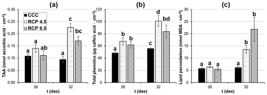 Measurements of (a) total antioxidant activity (TAA), (b) total phenolic content, and (c) lipid peroxidation in the fourth leaf of oilseed rape plants at 28 and 32 days after sowing (das). Graphs display averages ± standard errors of six leaf disks collected from six plants. Different lowercase letters indicate the significance of the measurements at p < 0.05. CCC: current climate conditions; RCP 4.5 and RCP 8.5: representative concentration pathways 4.5 and 8.5, respectively.