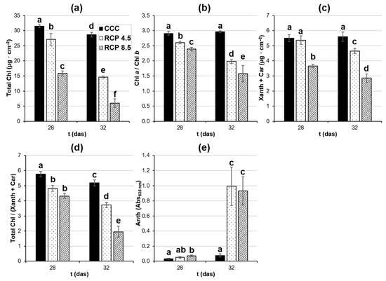 Since the visual changes in the plants grown under the analyzed RCPs suggested an impairment of pigment composition respecting to those grown at CCC, the content of Chl, Car, Xanth, and Anth were measured using invasive techniques at 28 and 32 das (Figure 3).