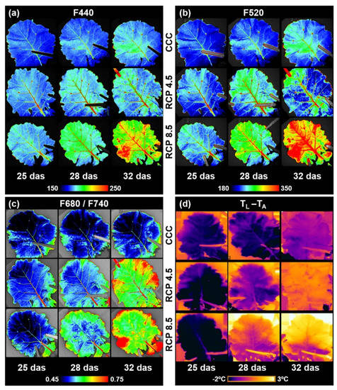 Images of the fourth leaf of oilseed rape plants captured with two different imaging sensors: a multicolor fluorescence camera (a–c) and a thermal camera (d). (a,b) blue (F440) and green (F520) fluorescence, respectively; (c) red over far red fluorescence ratio (F680/F740); (d) leaf temperature corrected by ambient temperature (TL − TA), showing transpiration patterns of the leaves. Experiments were made using twelve leaves per day after sowing (das) and climate conditions. Images correspond to the most representative data. False color scale is provided by the software of the corresponding cameras for a better interpretation of the images. CCC: current climate conditions; RCP 4.5 and RCP 8.5: representative concentration pathways 4.5 and 8.5, respectively.