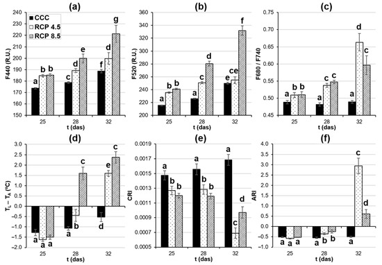 Numerical data obtained from images of whole leaves of oilseed rape plants. (a) Blue (F440) and (b) green fluorescence (F520), and (c) red over far-red fluorescence ratio (F680/F740). (a–c) were recorded using multicolor fluorescence imaging. (d) Leaf temperature corrected by ambient temperature (TL − TA) was obtained by a thermal camera; (e) carotenoids reflectance index (CRI) and (f) anthocyanins reflectance index (ARI) were measured by hyperspectral reflectance imaging. Graphs display averages ± standard errors of twelve leaves. Different lowercase letters indicate the significance of the measurements at p < 0.05. das: days after sowing. CCC: current climate conditions; RCP 4.5 and RCP 8.5: representative concentration pathways 4.5 and 8.5, respectively.