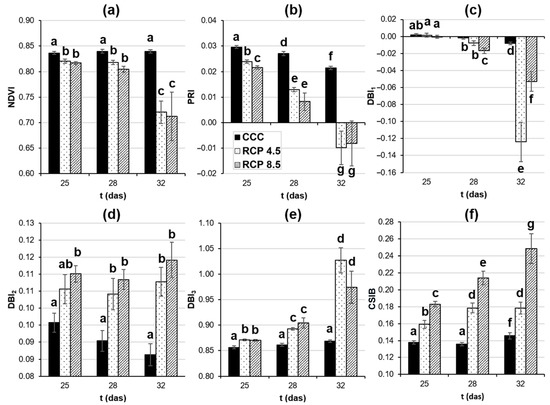 Vegetation indices obtained from hyperspectral reflectance measurements of the fourth leaf of oilseed rape plants. (a) Normalized difference vegetation index (NDVI). (b) Photochemical reflectance index (PRI). (c–e) Diseased broccoli index 1, 2, and 3 (DBI1–3). (f) Climatic stress index for brassicas (CSIB) was specifically developed to monitor the stress caused by the analyzed climate change conditions. Graphs display averages ± standard errors of twelve leaves. Different lowercase letters indicate the significance of the measurements at p < 0.05. das: days after sowing; CCC: current climate conditions; RCP 4.5 and RCP 8.5: representative concentration pathways 4.5 and 8.5, respectively.