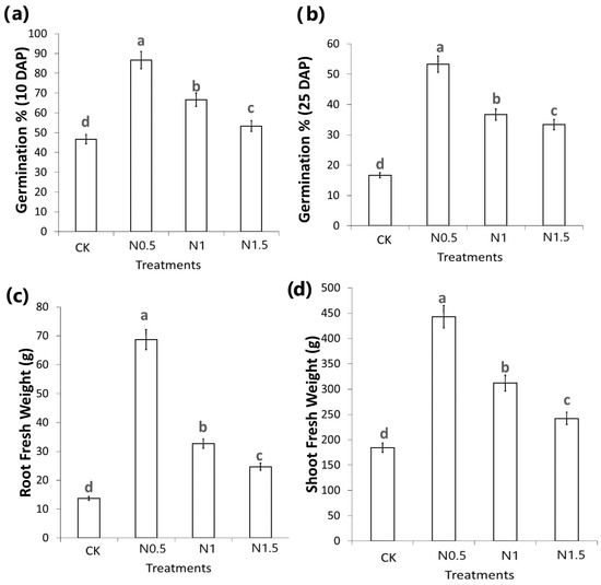 Mean comparisons of phenotypic traits after different NaCl treatments on the cotton seed under study: (a) germination percentage at 10 days after planting, (b) germination percentage at 25 days after planting, (c) root fresh weight at 25 days after planting, and (d) shoot fresh weight at 25 days after planting. Plots show statistical differences between treated samples. Bar plots with overlapping error bars are statistically insignificant; similarly, letters show statistical significance if samples do not share letters. CK: control: 0 h seed pretreatment NaCl, N0.5: 0.5 h seed pretreatment NaCl., N1: 1 h seed pretreatment NaCl, M12: 1.5 h seed pretreatment NaCl.