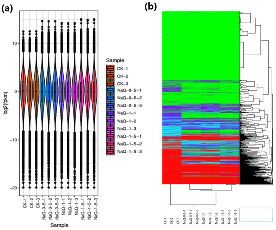 The FPKM values based on the gene expression level of 65,575 genes in samples from control and different treatments of 3% NaCl after 0.5, 1, and 1.5 h of soaking were demonstrated through violin plots (Figure 2a). The PCA analysis illustrated that the biological replicates of CK and all the treatments were grouped (Figure 2b).