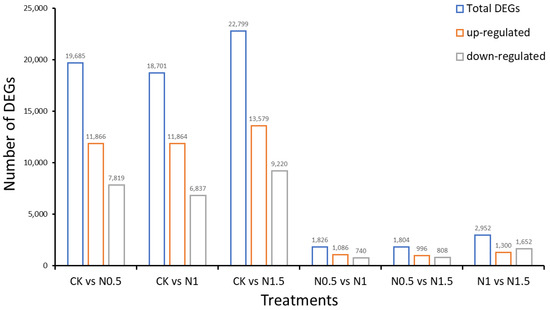 The identified DEGs with up- and down-regulated expressions across CK and treatment comparison groups were as follows: CK vs. N0.5: 19,686 (up-regulated 11,866; down-regulated 7819), CK vs. N1: 18,701 (up-regulated 11,864; down-regulated 6837), CK vs. N1.5: 22,799 (up-regulated 13,779; down-regulated 9220), N0.5 vs. N1: 1,26 (up-regulated 1086; down-regulated 740), N0.5 vs. N1.5: 1804 (up-regulated 1996; down-regulated 808), N1 vs. N1.5: 2952 (up-regulated 1300; down-regulated 1652) (Figure 3, Table S6b).